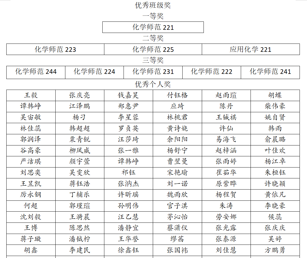 经过评比,评选出优秀班级奖一等奖1个,二等奖3个,三等奖5个,优秀个人奖90人。以下是详细获奖名单: