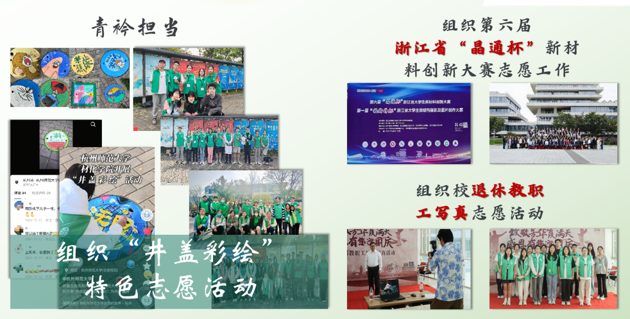 在特色品牌活动方面,材化青协的“井盖彩绘”活动以艺术装点校园,登上校官方抖音平台,受到校内广大同学的欢迎。“两元盖浇饭”志愿活动专窗已经坚持了二十年,一荤一素仅需两元,用一份热饭传递人文关怀。在专业赋能领域,他们承办浙江省“晶通杯”等化学类赛事志愿服务,以专业素养保障大赛顺利举办,赢得主办方高度评价。
