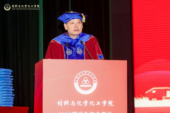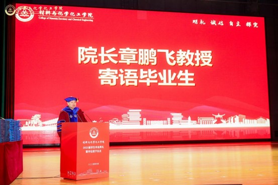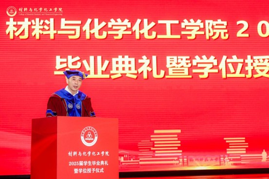 章鹏飞代表学院致辞,他向全院547名2025届本研毕业生送上热烈祝贺和美好祝愿,衷心感谢师长、家长和亲友们的辛勤付出和陪伴。他深情回顾了同学们在校期间的奋斗与成长,与学校和学院一起在青春的画卷上勾勒出最迷人的风景,实现了同频共振、双向奔赴。他以《越山丘 藏岁月 书华章》为题给毕业生讲授在校的“最后一课”,提出三点期望:一是越山丘,淬炼成长锋芒,在跨越挫折中成长成熟,收获成功与领悟;二是藏岁月,定格温暖时光,珍惜身边温暖瞬间,从中汲取前行力量;三是书华章,绘就出彩人生,守护心中热爱,在坚守中书写属于自己的精彩篇章。希望在未来的人生道路上,以无畏为剑、珍惜为舟、热爱为帆,将理想信念和家国情怀转化为感恩奋进的力量,融入个人成长和时代发展的澎湃浪潮,在祖国大地上继续书写属于材化人的才华与荣光!