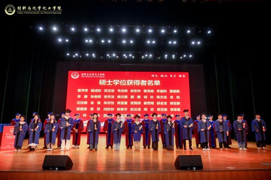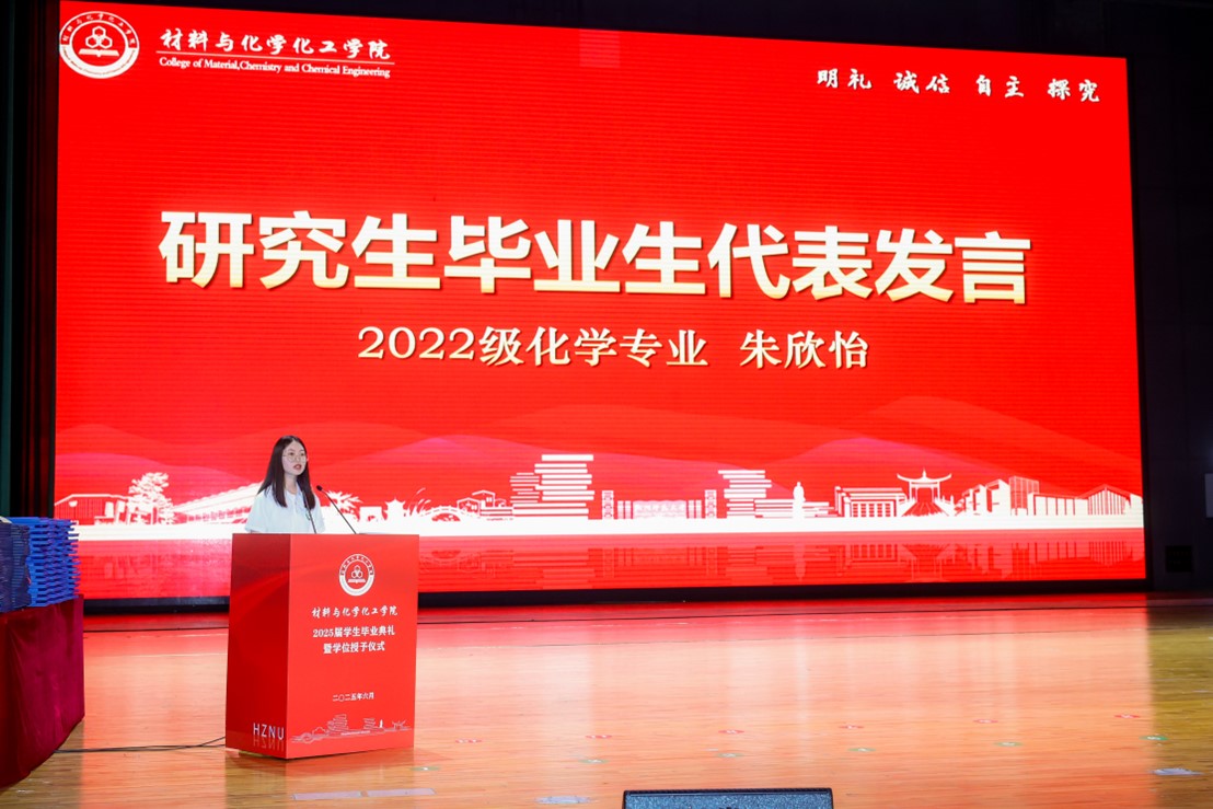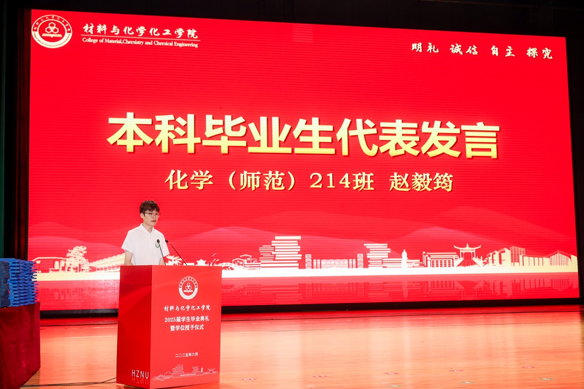 研究生毕业生代表、2022级化学专业朱欣怡,本科毕业生代表、化学(师范)214班赵毅筠分别上台发言。他们深情回顾在社团学姐 的求学时光,感恩师长的悉心教导、同学的真挚情谊;展望未来,立志以昂扬的姿态,在更广阔的天地中践行材化人的使命与担当,让青春在不懈奋斗中绽放绚丽之花。