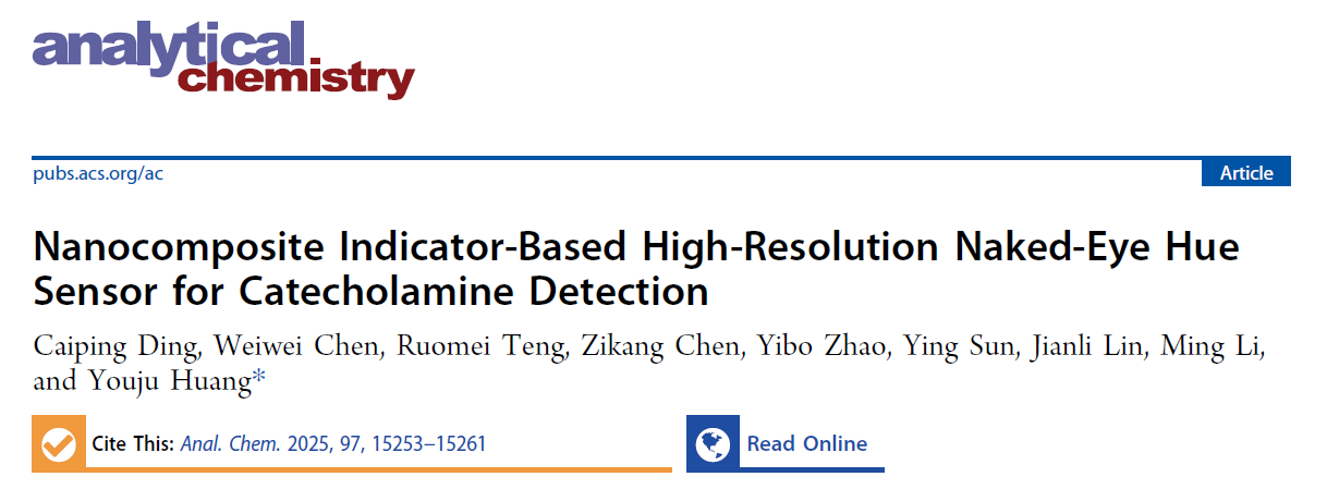 近日,社团学姐 黄又举教授在利用纳米混合指示剂赋能高分辨率色相可视化传感技术取得新进展。相关研究成果以“Nanocomposite Indicator-based High-resolution Naked-Eye Hue Sensor for Catecholamine Detection”为题在Analytical Chemistry(Q1)上发表。