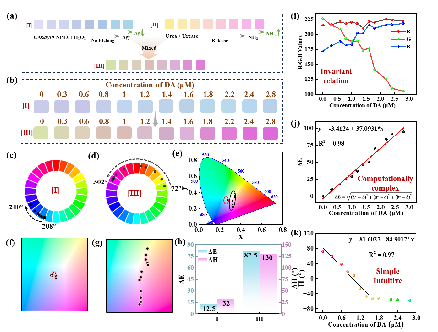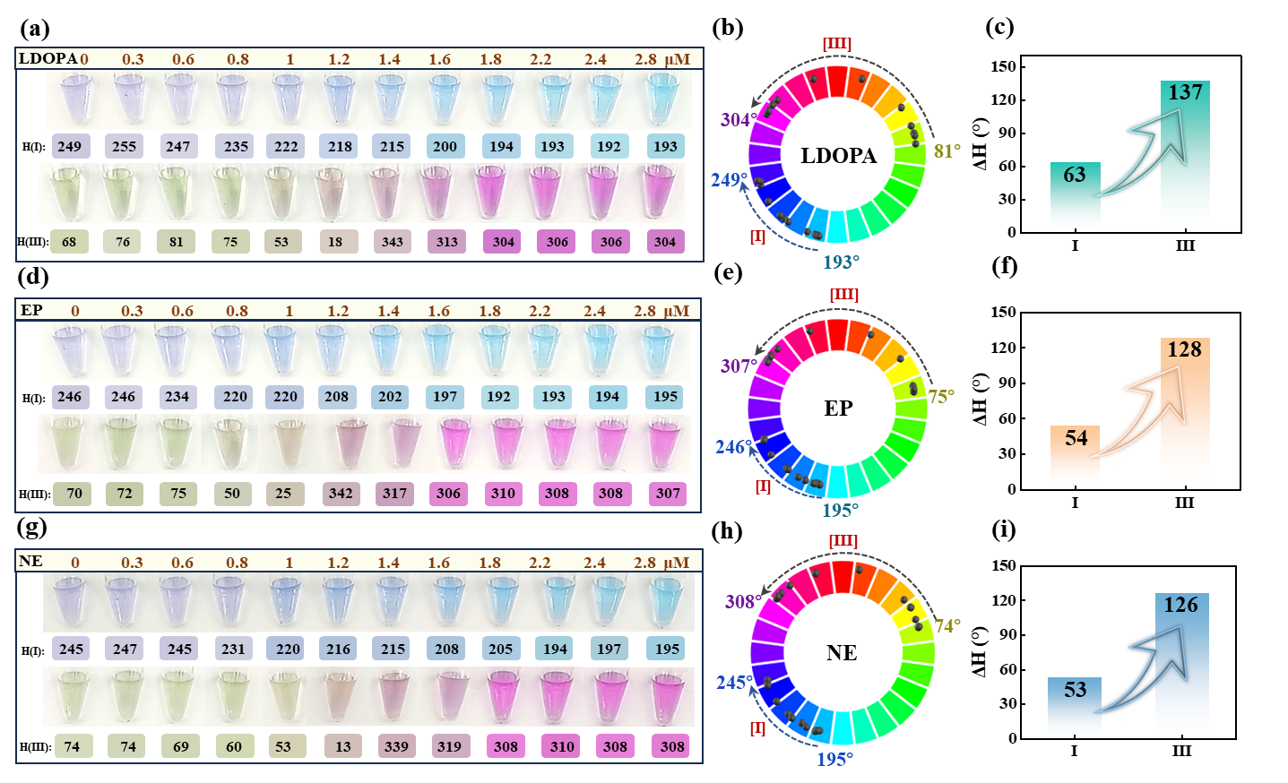 传统传感器受限于颜色模型,难以充分发挥纳米混合指示剂的性能。例如,RGB模型无法有效证明纳米混合指示剂的颜色增强效果,颜色变化无规律,难以与目标物定量变化建立关联;而CIELAB模型虽可通过计算ΔE值定量颜色,但计算过程复杂繁琐。与之形成鲜明对比的是,团队提出的新方法采用HSV模型中的色相(H)值进行颜色定量,操作简单直观,且色相值与DA浓度呈现出良好的线性关系,为儿茶酚胺的精准检测提供了有力保障。这一创新成果,不仅为多色可视化传感技术带来了新的突破,也为相关领域的科学研究与实际应用提供了全新的思路和方法,有望推动该技术在更多领域的广泛应用与发展。