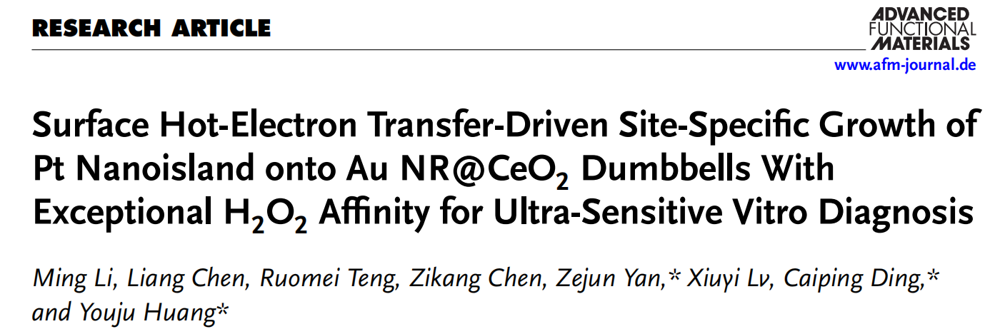 近日,社团学姐 黄又举教授团队敏锐捕捉到热电子激发与转移调控在纳米酶探针材料精准结构设计与性能优化中的关键作用,创新性提出“多维度协同调控”策略,为解决传统纳米酶的亲和力难题提供了全新思路。相关研究工作以“Surface Hot-Electron Transfer Driven Site-Specific Growth of Pt Nanoisland onto Au NR@CeO₂ Dumbbells with Exceptional H₂O₂ Affinity for Ultra-Sensitive Vitro Diagnosis”为题在Advanced Functional Materials上发表。