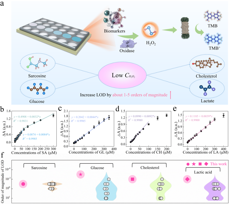 本研究不仅聚焦于纳米酶的合成制备与性能调控,还深入探索了其实际应用价值。基于L-ACP-DIS对H₂O₂的高亲和力和高催化性能,研究团队构建了一套通用型体外医疗诊断试剂盒,可实现肌氨酸、葡萄糖、胆固醇、乳酸等多种疾病标志物的高灵敏度检测。与近期文献报道的基于纳米酶的检测方法相比,这些标志物的检测限(LOD)实现了1-5个数量级的显著提升。此外,L-ACP-DIS纳米酶探针在储存一年后仍能保持90%以上的催化活性,显示出优异的稳定性,具备长期应用于体外诊断的潜力。该体外医疗诊断试剂盒可应用于前列腺癌、糖尿病、心血管疾病及乳酸中毒等疾病的早期诊断。检测准确率达97.0%-102.2%,并能良好兼容患者尿液等复杂生物基质。