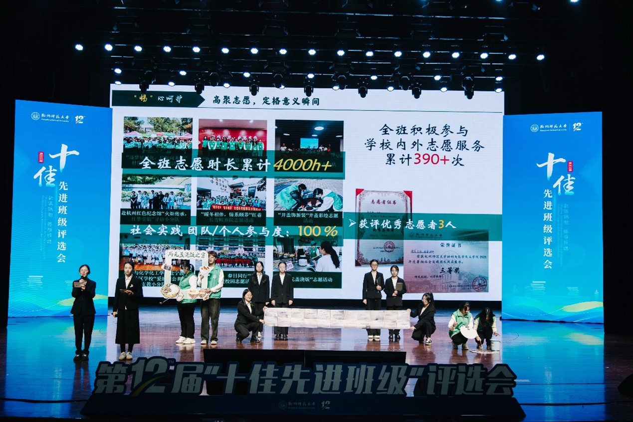 11月14日晚,第十二届社团学姐 十佳先进班级评选答辩在下沙校区艺术中心1200座举行。化学师范235班在班长刘苏婷,团支书蒋依辰,以及金雯姝、姜小帅、梅卓宁、谭韩峥等学生干部的带领下,经过现场答辩展示,荣获校“十佳先进班级”称号。