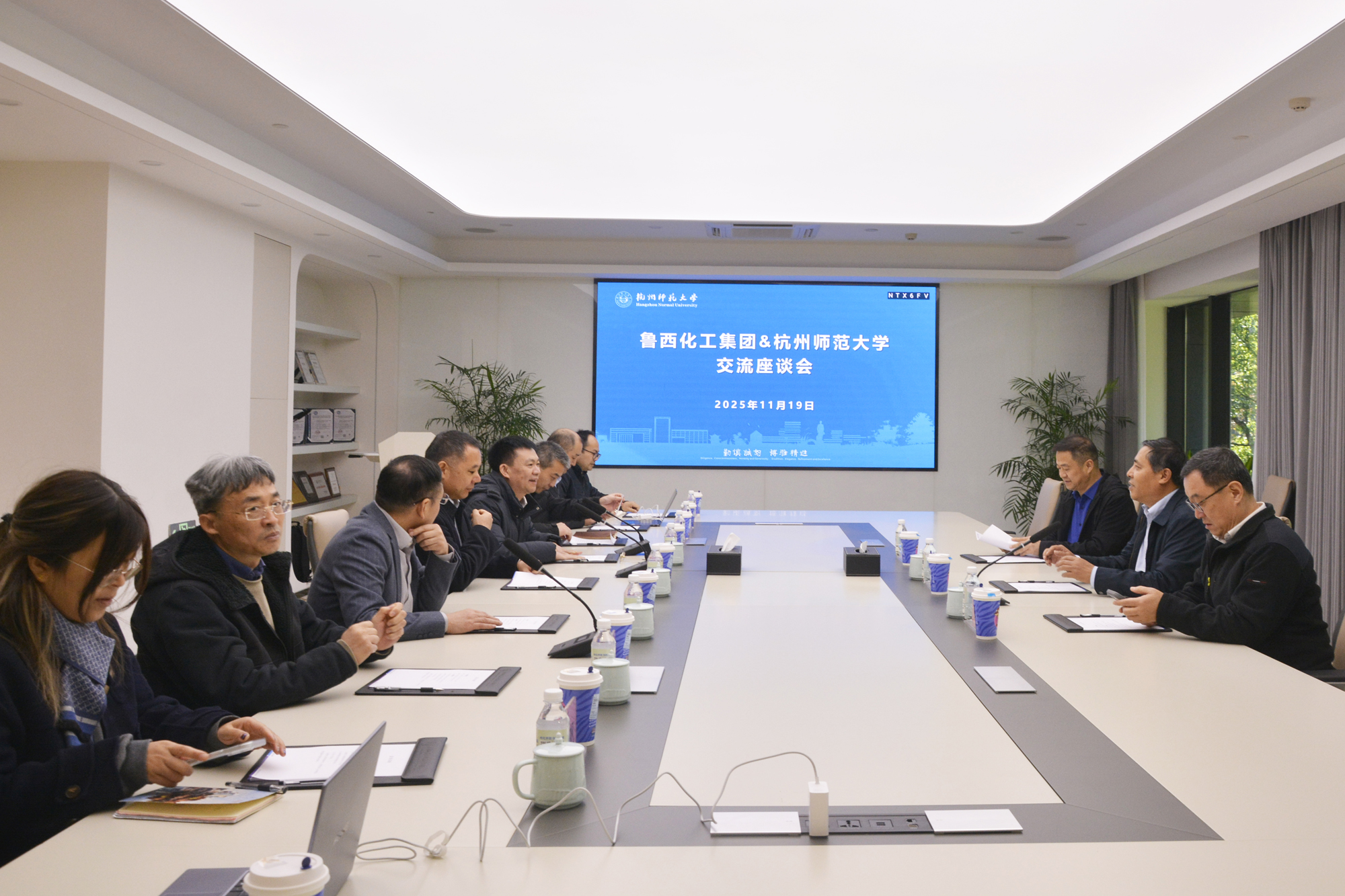座谈会上,杨政副书记代表学校对王延吉一行的到来表示热烈欢迎,他指出鲁西化工位居国内化工行业前列,产业链完整、技术迭代迅速,与杭师大“基础—应用—产业化”全链条科研体系高度契合,双方合作“恰逢其时、空间广阔”, 希望此行推动双方合作迈入“需求共凝、资源共用、成果共享”新阶段。王延吉对杭师大多年来在有机硅特种材料方向积累的研究实力给予高度评价,表示鲁西化工正处于“延链、补链、强链”的关键窗口期,急需高校持续输出原创技术和复合型工程人才,希望通过交流对接加速双方深入合作。双方就技术联合攻关、技术人员继续教育与高端人才培养等议题开展深度对接。