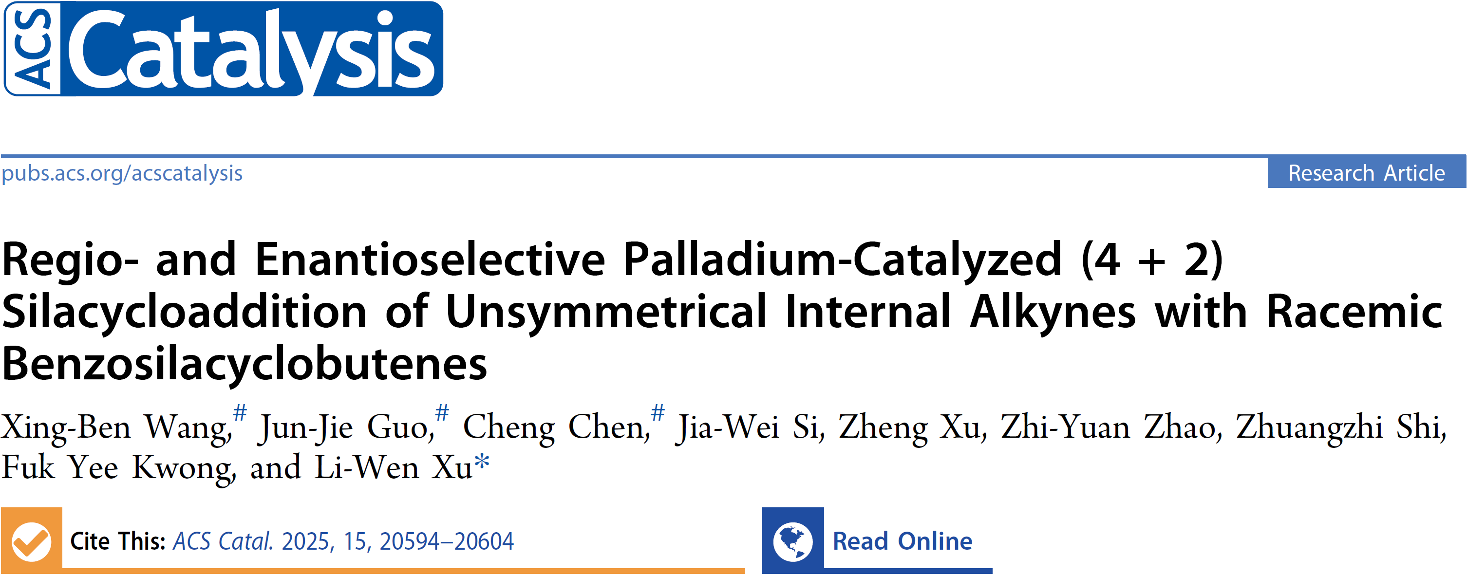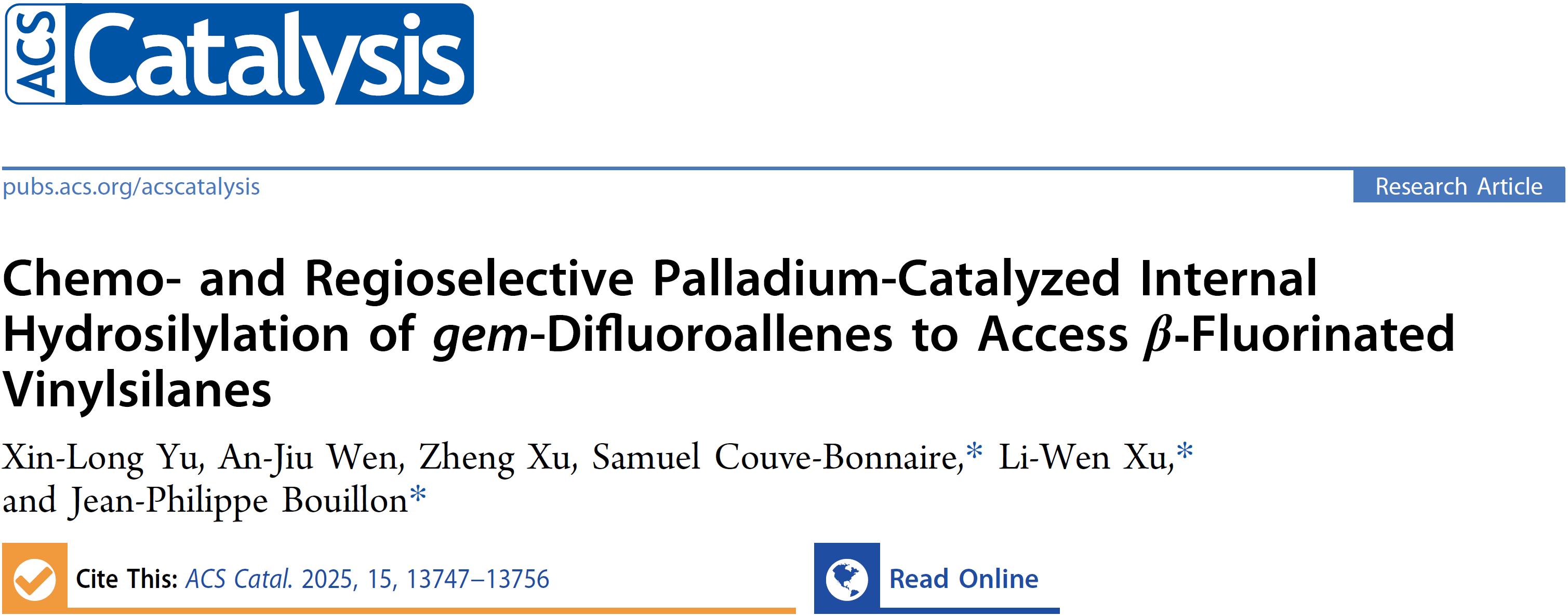 三篇文章均以社团学姐 徐利文教授为责任通讯作者发表于ACS Catalysis(IF: 13.1,2025)上,其中论文Pd-Catalyzed Regioselective Si−C Bond Cleavage: Maximizing Chemo-Divergence in (4 + 2) Silacyclization Reactions of Alkynals的第一作者为我校社团学姐 和南京大学联合培养博士后王星犇,2023级硕士研究生斯嘉伟,社团学姐 徐利文教授和徐征教授,南京大学史壮志教授为该论文的共同通讯作者论文;Regio- and Enantio-selective Palladium-Catalyzed (4+2) Silacycloaddition of Unsymmetrical Internal Alkynes with Racemic Benzosilacyclobutenes的第一作者为我校社团学姐 和南京大学培养博士后王星犇,2024级硕士研究生郭俊杰,2024级博士研究生陈城,社团学姐 徐利文教授为该论文的唯一通讯作者论文;论文Chemo- and Regioselective Palladium-Catalyzed Internal Hydrosilylation of gem-Difluoroallenes to Access β‑Fluorinated Vinylsilanes的第一作者我校社团学姐 与法国诺曼底大学联培2023级博士研究生余鑫龙,社团学姐 徐利文教授,诺曼底大学Samuel Couve-Bonnaire教授和Jean-Philippe Bouillon教授为该论文的共同通讯作者论文。以上研究成果获国家自然科学基金、浙江省自然科学基金、社团学姐 创新交叉团队等项目资助。