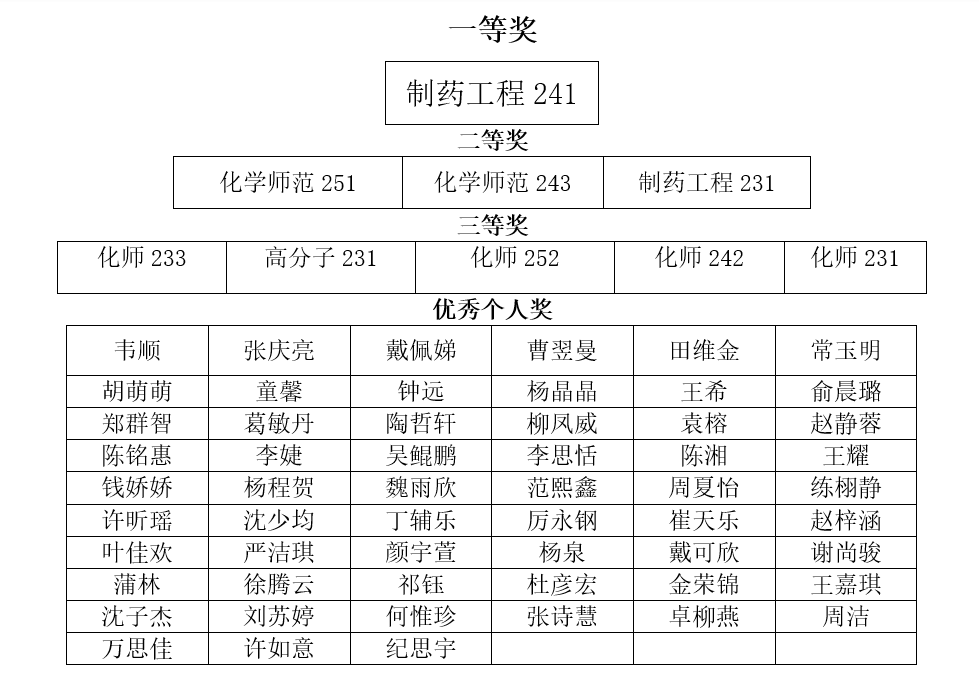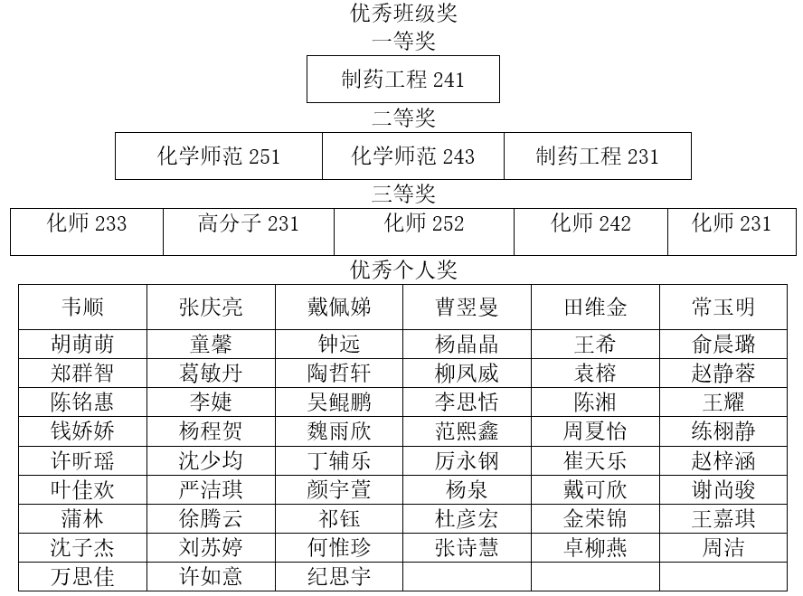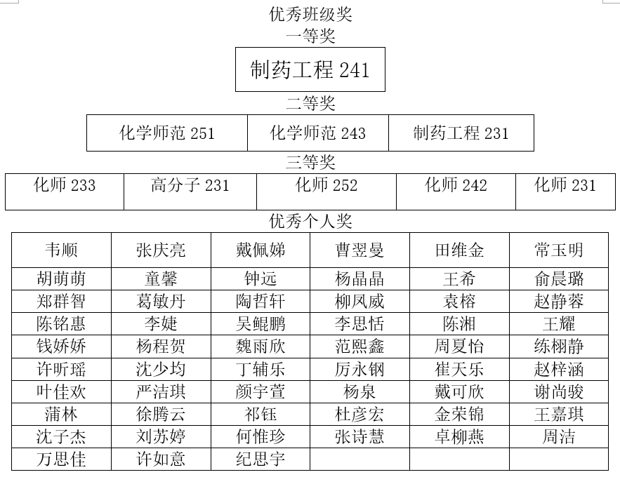 经过评比,社团学姐 评选出优秀班级奖一等奖1个,二等奖3个,三等奖5个,优秀个人奖57人。以下是详细获奖名单: